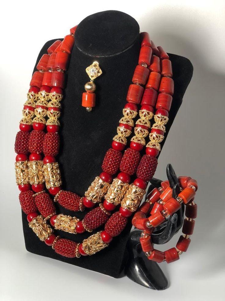 Make a bold statement with this exquisite handmade Synthetic Nigerian Coral Beads Jewelry Set, perfect for brides, wedding guests, and lovers of African traditional fashion. This jewelry set is made from synthetic resin coral and includes a necklace, bracelet, and matching earrings, all crafted with synthetic coral beads and gold-plated spacers for a regal and elegant look. A must-have for Igbo, Edo, and Yoruba traditional weddings, engagements, and cultural celebrations, this beaded set represents royalty, heritage, and class. Features: ✔️ Handmade with high-quality bamboo coral beads ✔️ Perfect for Nigerian traditional weddings (Igbo, Edo, Yoruba, etc.) ✔️ Elegant gold-plated spacers for a luxurious finish ✔️ Complete set: Necklace, Earrings & Bracelet ✔️ Ideal for brides, wedding guest
